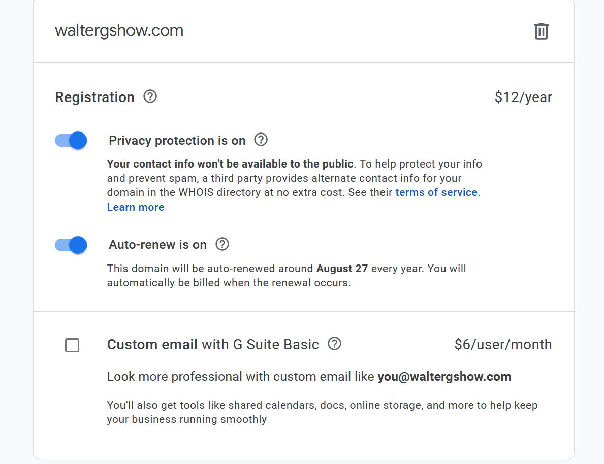 Also note that you have the option of setting up G Suite Basic for your new domain at this time. This will link your domain to a Gmail email account along with Google Drive storage. It is optional and can also be set up at a later time.