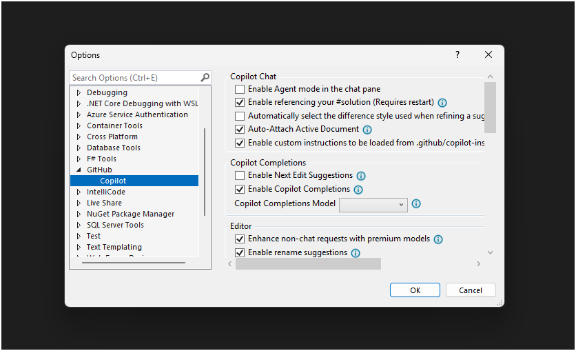 This will bring up the "Options" menu highlighting the "Copilot" configuration settings: