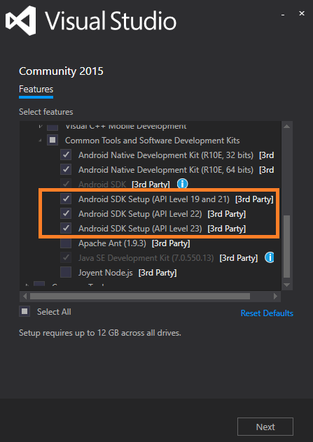 The easiest way to install Xamarin is to update your Visual Studio to the latest version. That installer can be located here. During the installation you will be asked which SDK's you will want to download. To be safe, I selected all of the ones available, at a very hefty cost to my storage space I will add.
