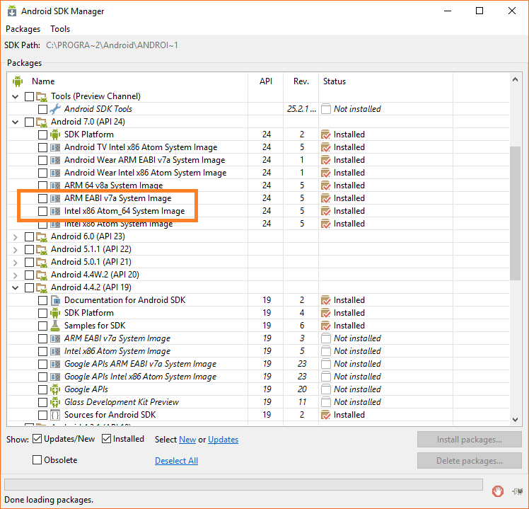 I however, found that unsuccessful, as I had an older version of HAXM on my machine and Visual Studio insisted on selecting that one before any others. So just to be safe, remove any version of HAXM on your computer, then do a fresh install on your machine. In the SDK Manager you should then see the following: